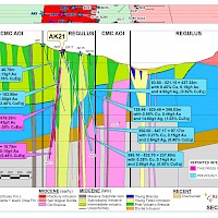 Notes: (1) number of holes (“a number of holes”), meterage and location not known; (3) meterage and location not known; (1, 3) no assays; (2) Cu assays only; (1-3) no drill core; (1-3) not in database; (4) Parts of CMC holes that cut Regulus concessions.Historical diamond drilling was carried out pre-1997 by Northern Peru Mining & Smelting Corporation (1923), Cerro de Pasco Corporation (1964), and Kennecott Corporation (1970). No accurate drill hole locations, azimuths or plunges for these holes have been located. In addition, no assays with certificates, drill core or other information from these holes has been found and hence they are not included in the Regulus database, nor were they used in either the 2012 Southern Legacy Minerals resource or the pending 2019 Regulus Resources resource calculations.